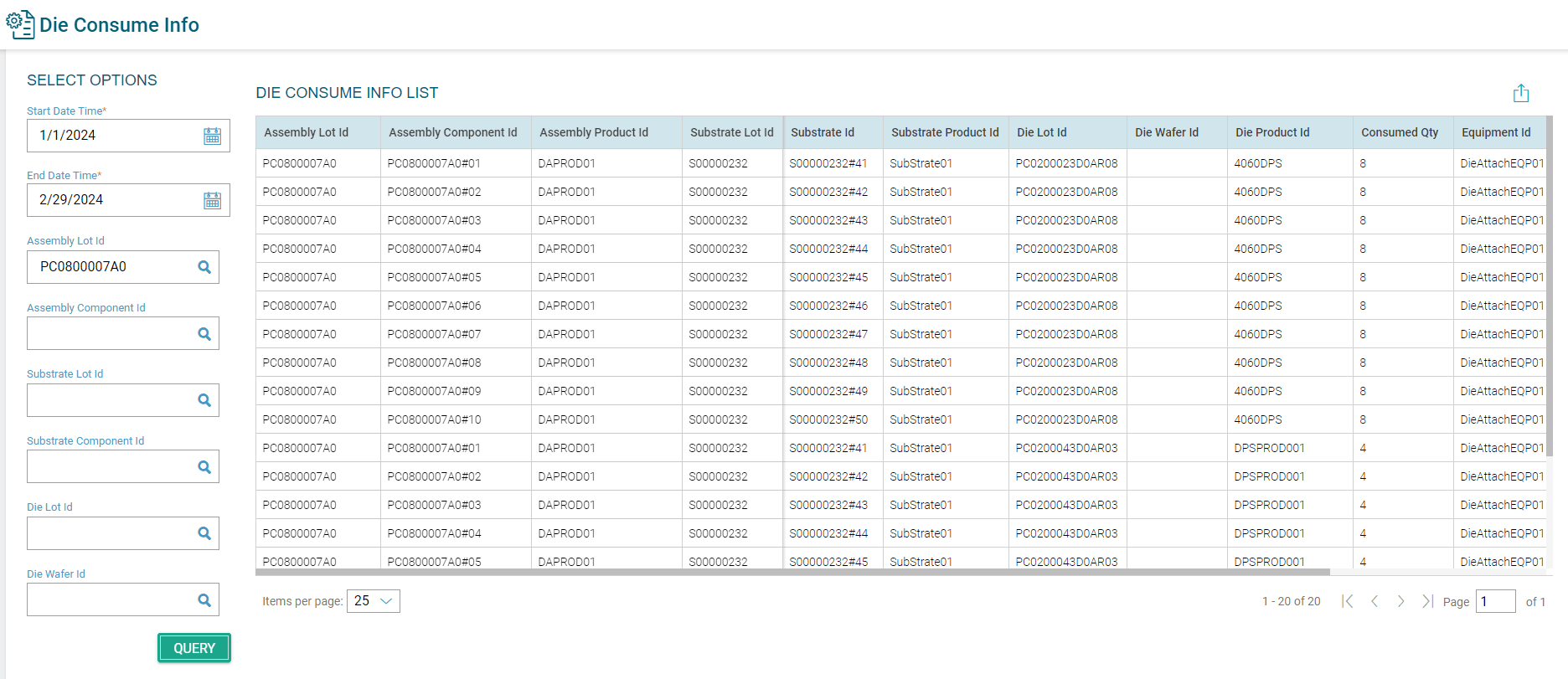 SmartFactory MES for ATPは、消費されたチップ(ダイ)の数量およびチップ(ダイ)/基板の位置情報に関する包括的なトレーサビリティレポートを提供します。