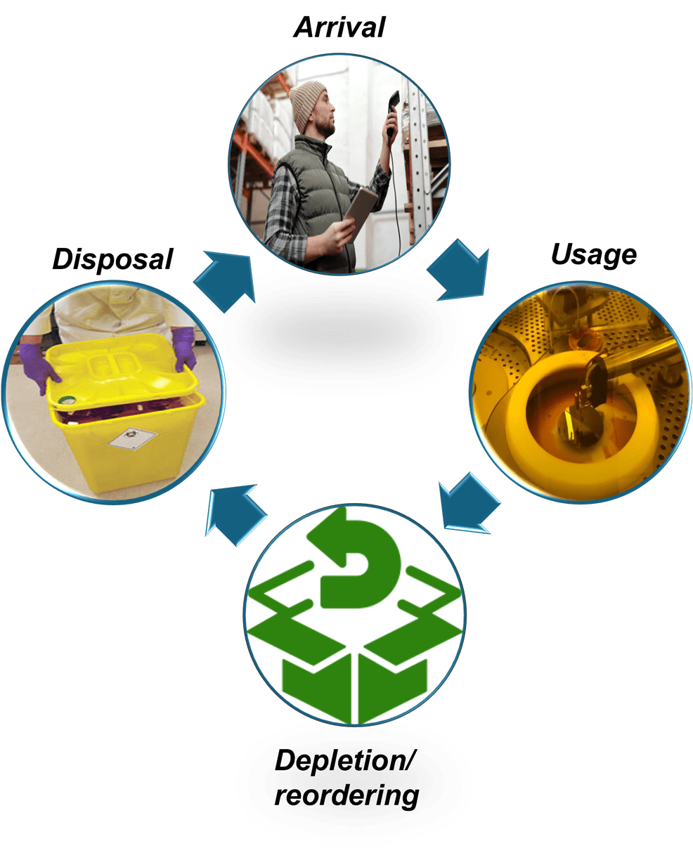 Arrival and storage: Upon arrival, consumables are logged into inventory systems with details such as expiration dates and storage conditions.
